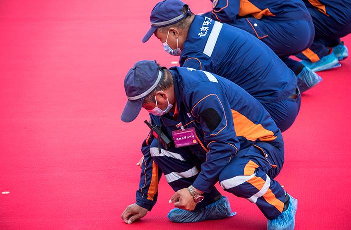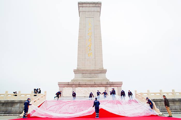 上午8时25分,人民英雄纪念碑红毯清理作业开始,现场服务保障人员统一行动、分组作业,15分钟完成地毯防水塑料布撤除,采用“清扫、粘取”循环作业工艺,40分钟完成红毯清理清洁。