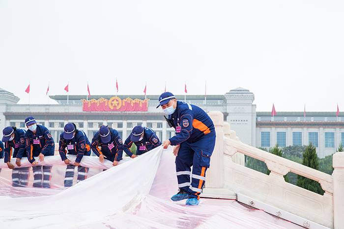 9月30日凌晨5时,天空下起小雨。全体服务保障人员冒雨作业,47名保洁员列队进入广场戒严区,配合作业车辆集中清理。在升旗仪式结束后,按照随清随撤工作要求,保障人员快节奏高效率、仅用时15分钟就完成广场地面清扫保洁工作。