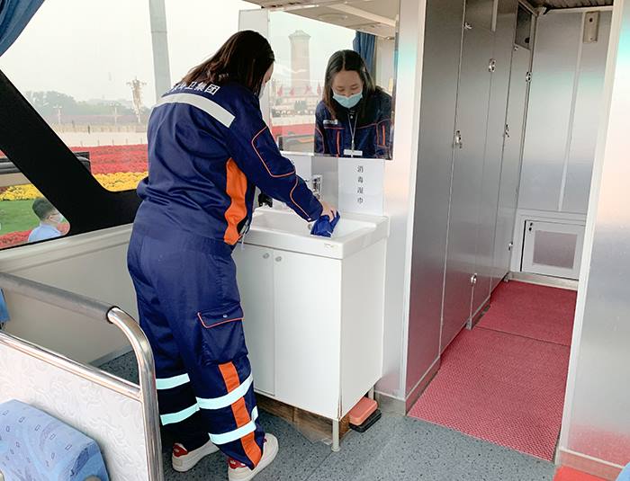 为了满足现场观众及各方工作人员的如厕需求,北京机扫公司装备服务中心时传祥班组提前完成篷帐厕所的搭建及拖挂卫生间入位、摆放工作,对卫生间进行了细致维护和全面保洁,配齐消毒洗手液、纸巾等物品,确保卫生间各项功能运转正常,同时做好防疫消杀工作。