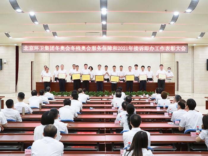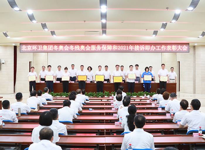 会上宣读了冬奥会冬残奥会服务保障和2021年接诉即办工作表彰决定。集团生产运营部、北京机扫公司、固废物流公司、南宫生物质公司、北KY开元境河北分公司5家单位被授予冬奥会冬残奥会服务保障工作突出贡献集体荣誉称号;集团党委宣传部、监察专员办公室等16家单位被授予优秀集体荣誉称号;刘亚淘等168名同志被授予先进个人荣誉称号。北京机扫公司、通州KY开元公司、固废处理公司阿苏卫填埋场3家单位被授予集团2021年接诉即办工作先进集体荣誉称号;田泽宇等7名同志被授予先进个人荣誉称号。集团领导分别为受到表彰的突出贡献集体、优秀集体和先进个人代表颁奖。